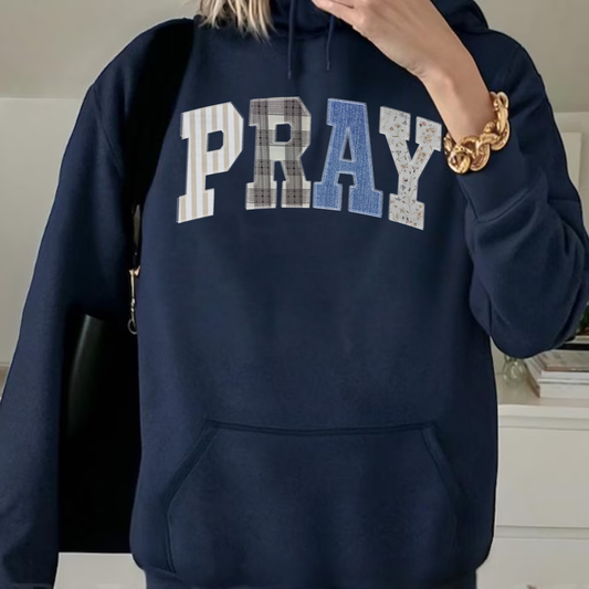 PRAY Patchwork Hoodie – Faith-Inspired Cozy Sweatshirt