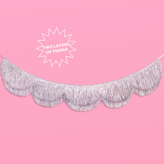 Shimmer Scallop Fringe Banner – 6ft Double Layered Silver Iridescent Party Garland
