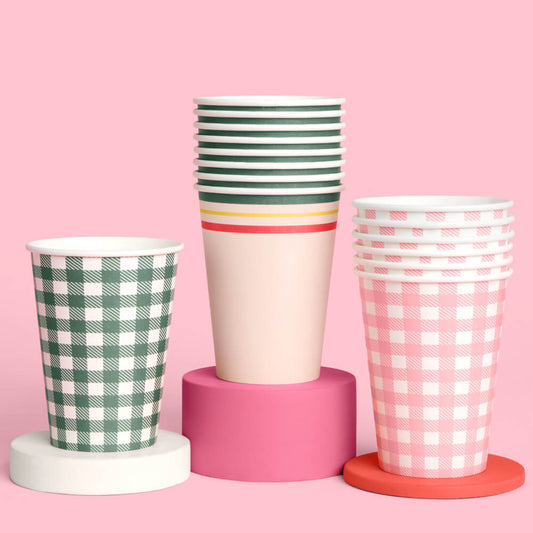 Camp Bride Paper Cups – 24 Pack 12 oz Gingham & Retro Stripe Bachelorette Party Cups