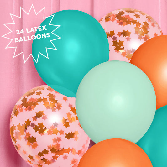 Showgirl Balloon Pack – 24ct Teal, Orange & Star Confetti 12” Latex Balloons for Birthday & Bridal Parties