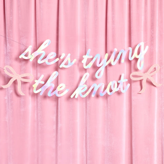 She’s Tying the Knot Banner – Iridescent Foil Bridal Shower & Bachelorette Party Decor (4.5 Ft)