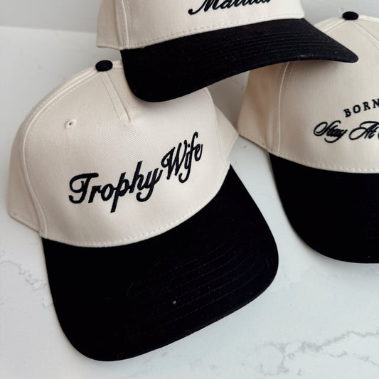 Trophy Wife Embroidered Trucker Hat – Two-Tone Cream & Black Women’s Baseball Cap | Bachelorette, Bride, Gift for Her