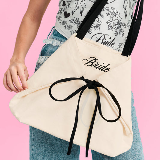 Bride Ivory Canvas Tote Bag – Black Embroidered Bridal Weekender Bag with Adjustable Front Tie – Bachelorette & Honeymoon Travel Tote