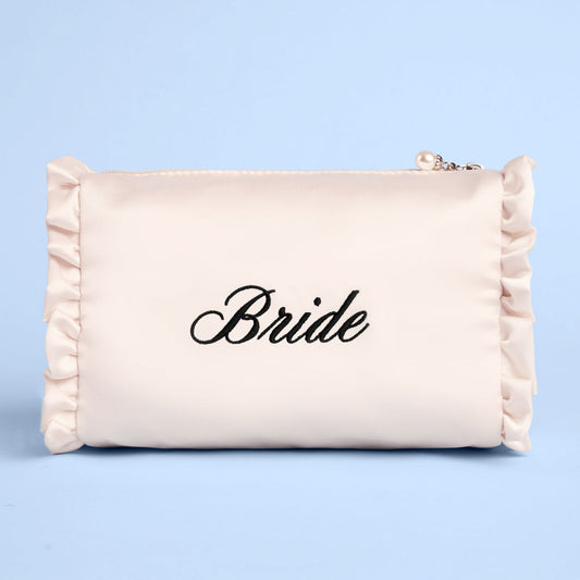 Bride Satin Cosmetic Bag with Pearl Zipper – Cream Ruffle Makeup Pouch for Bachelorette, Bridal Shower & Wedding Day Essentials