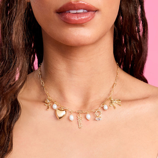Gold Bride Charm Necklace – Bridal Bow, Heart, Rose & Rhinestone Ring Pearl