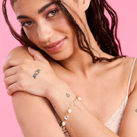 Gold Bride Charm Bracelet – Bridal Bow, Rhinestone Ring & Heart with Pearl Accents