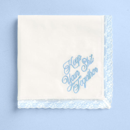 Keep Your Sh*t Together Wedding Handkerchief – White Lace Bridal Hankie with Blue Embroidery