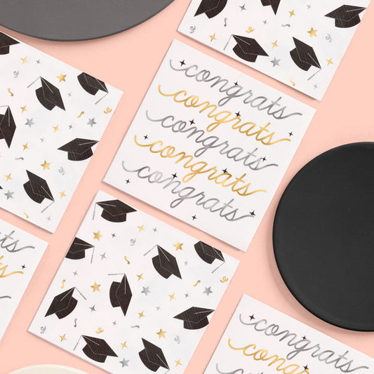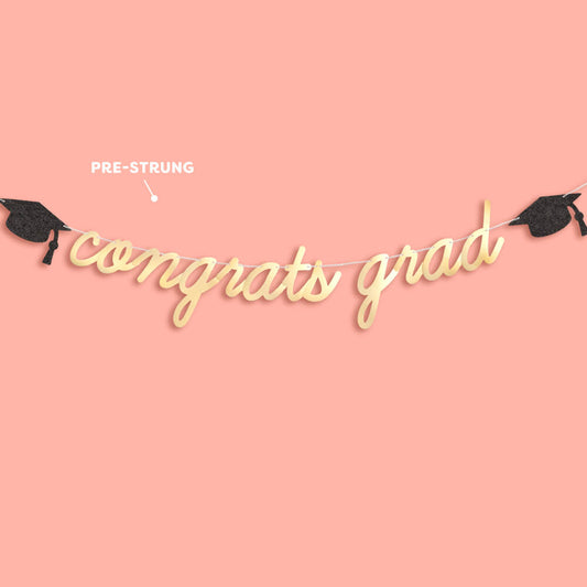 Congrats Grad Gold Foil Banner with Black Glitter Caps & Silver Iridescent Fringe
