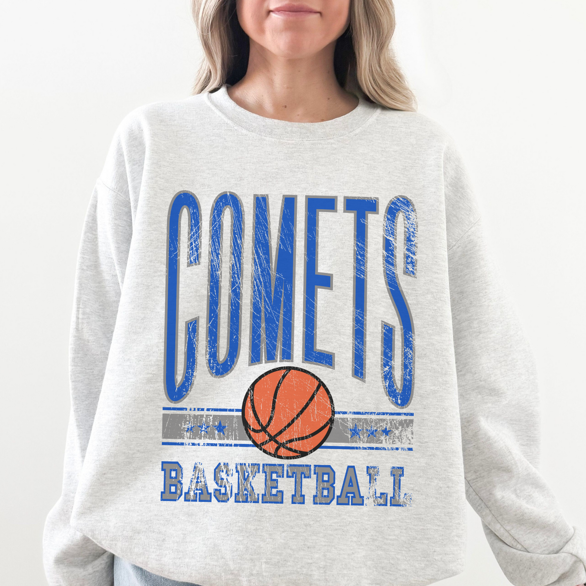 • Retro distressed design with bold blue COMETS text and orange basketball graphic