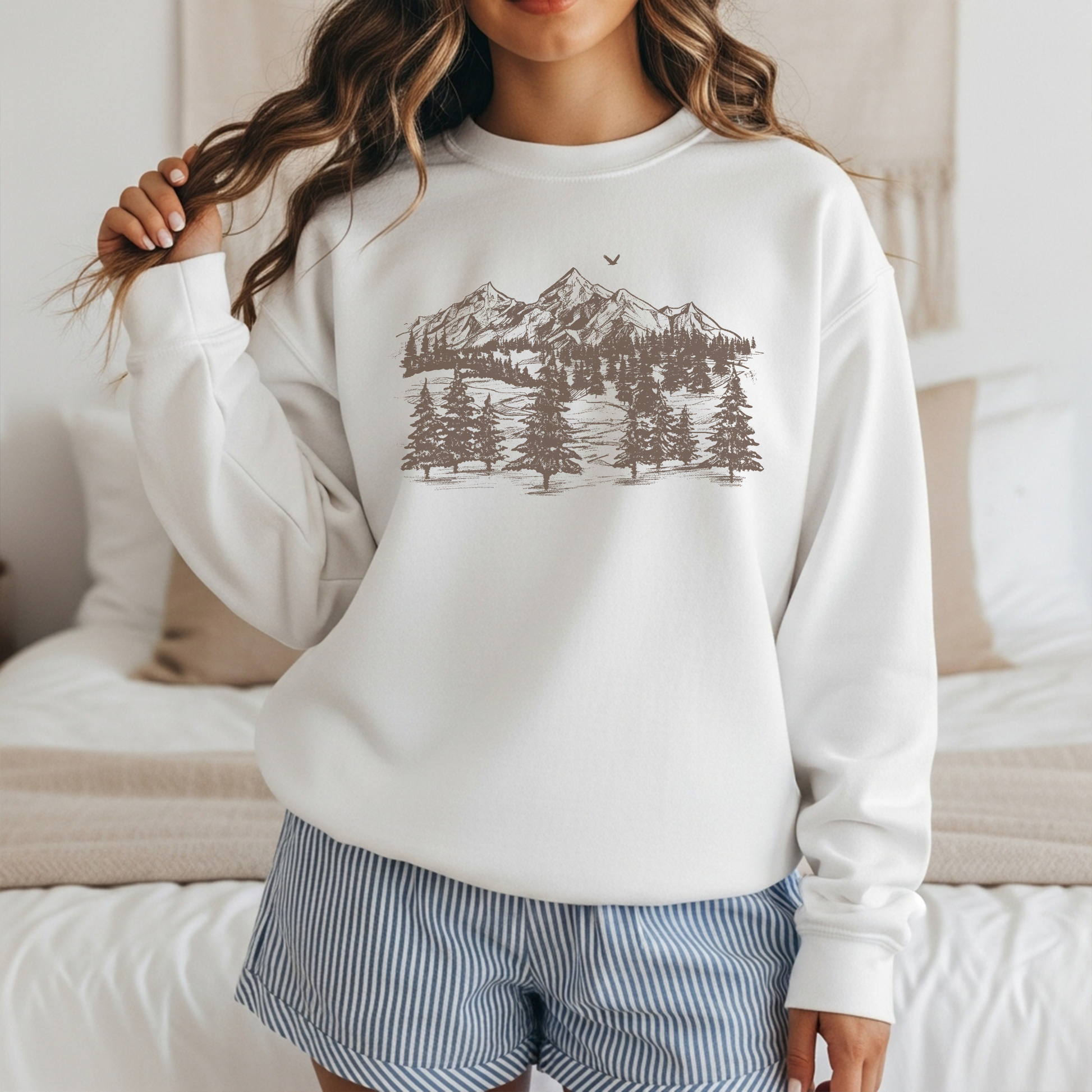 Cozy up in this Mountain View Crewneck Sweatshirt — a soft, classic-fit pullover that brings the beauty of the outdoors to your everyday wardrobe. Featuring a detailed line-art mountain and pine tree scene, this design captures that peaceful, cabin-in-the-woods feeling all year long.