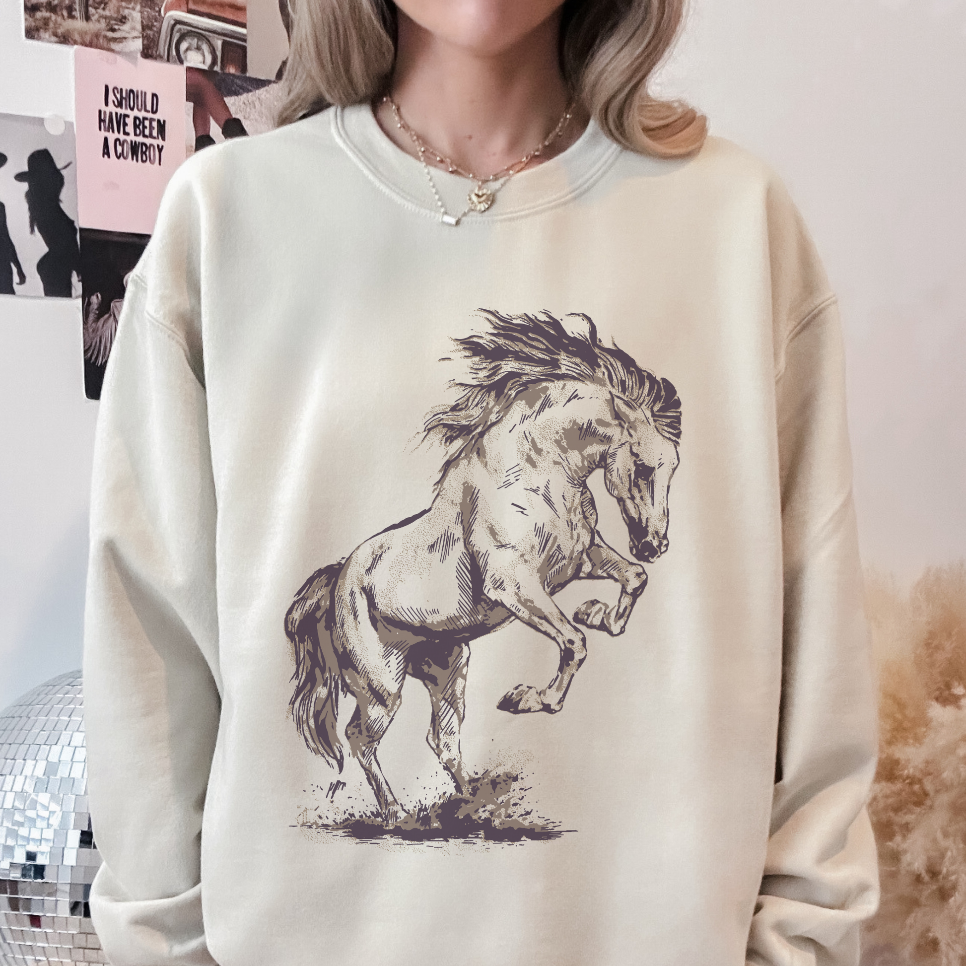 Channel your western spirit in our Wild Mustang Graphic Sweatshirt — featuring a hand-drawn sketch of a free-spirited horse in motion. Designed for comfort and style, this cozy crewneck is perfect for casual days, country concerts, or a weekend at the ranch.